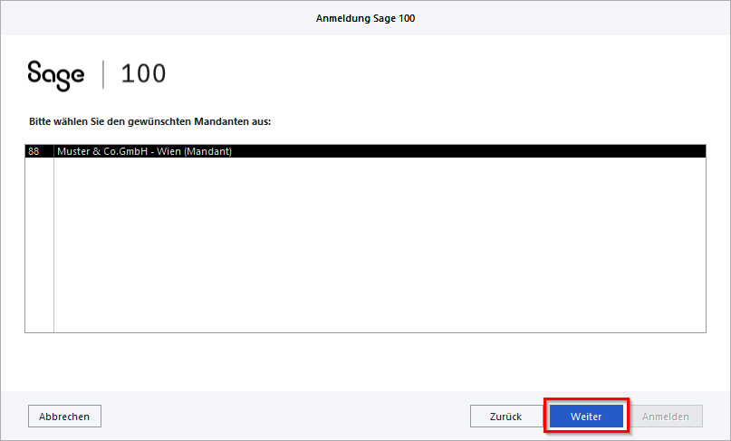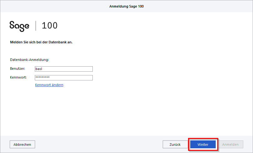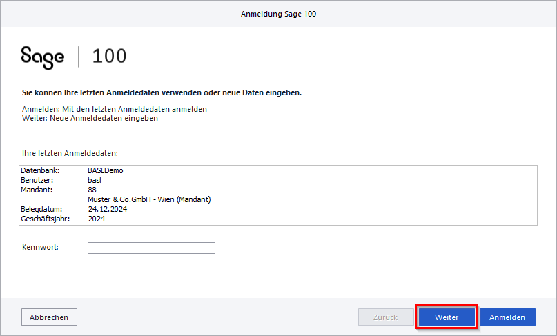 - Im nächsten Schritt den Benutzer mit dessen Kennwort wählen, der berechtigt ist, ein Geschäftsjahr anzulegen und auf Weiter klicken: