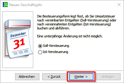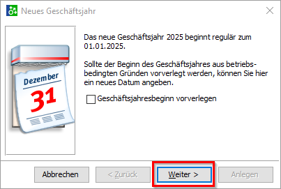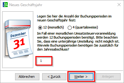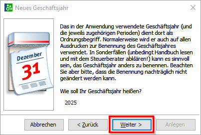 Wird nur ein weiteres Geschäftsjahr angelegt kann das folgende Fenster mit "Weiter" bestätigt werden: