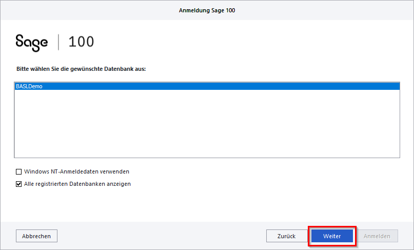 - Die Datenbank mit dem Mandanten auswählen, für den eine neues Wirtschaftsjahr angelegt werden soll und anschließend Weiter gehen: