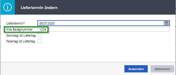 Im Unterschied zum Einkauf kann im Verkauf auch der Belegliefertermin (also für die gesamte Auftragsbestätigung, und nicht nur die einzelnen Positionen) geändert werden: Liefertermine geändert, es erfolgt kein automatisierter Druck. Dafür stehen die Standardfunktionen der Sage100 zur Verfügung.