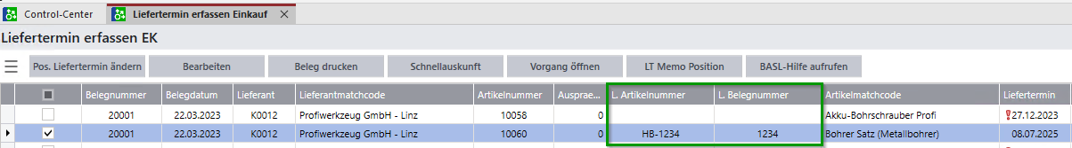 Mit der neuen Version der BASL-Erweiterungen ist es nun möglich, die Belegnummer der Auftragsbestätigung des Lieferanten zu erfassen. Zwei zusätzliche Spalten wurden eingeführt: In der ersten Spalte wird die Lieferanten Artikelnummer angezeigt, in der zweiten Spalte die Belegnummer der Auftragsbestätigung.