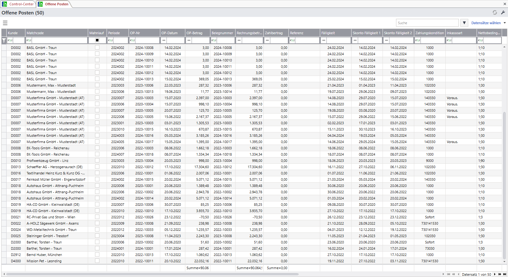 Diese Übersicht zeigt alle Offenen Posten eines Kunden, bzw. eine Gesamtübersicht der Kunden-OPs. Anwender haben nur Zugriff auf die Offenen Posten eines Kunden im Stammdatendialog, oder in der VK-Belegerfassung (mit den BASL Erweiterungen). Oft sind aber Informationen dazu in einer Listenform notwendig, um z.B.mit den Kunden Details zu einem Offenen Posten klären zu können.